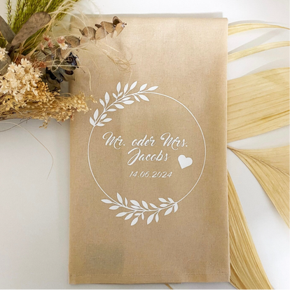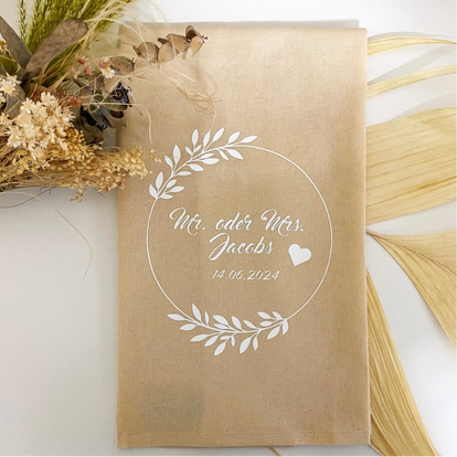 Auf dem Geschirrtuch wird "Mr. & Mrs. Wunschname" und das "Hochzeitsdatum" in einer weißen Schrift stehen.