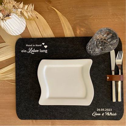 Hier bieten wir Euch tolle personalisierte Tischset's an. Oben links befindet sich der Spruch "Hand in Hand ein Leben lang" und unten rechts können Eure Namen und Euer Wunschdatum stehen. Hier bei handelt es sich immer um ein 2er Set.