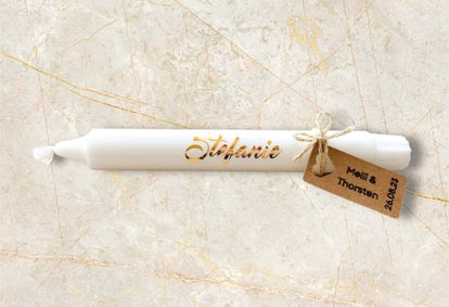 Willkommen bei unserem Angebot für personalisierte Stabkerzen! Ob als stilvolles Gastgeschenk oder als elegantes Namensschild für Ihre Hochzeit – unsere individuell gestalteten Stabkerzen verleihen Ihrem besonderen Tag eine persönliche Note. Jede Kerze wird liebevoll nach Ihren Wünschen gestaltet, sodass sie perfekt zu Ihrem Hochzeitsmotto und Ihrer Dekoration passt.