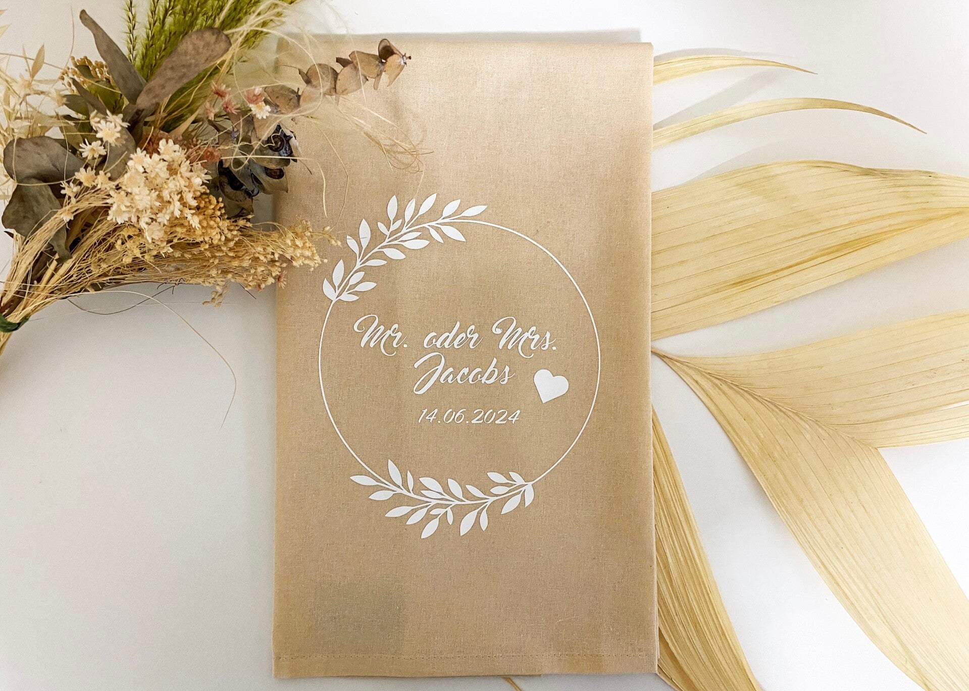 Auf dem Geschirrtuch wird "Mrs. Wunschname" und das "Hochzeitsdatum" in einer weißen Schrift stehen.
