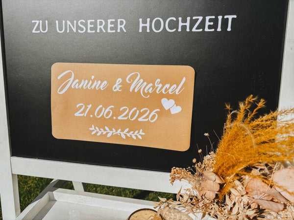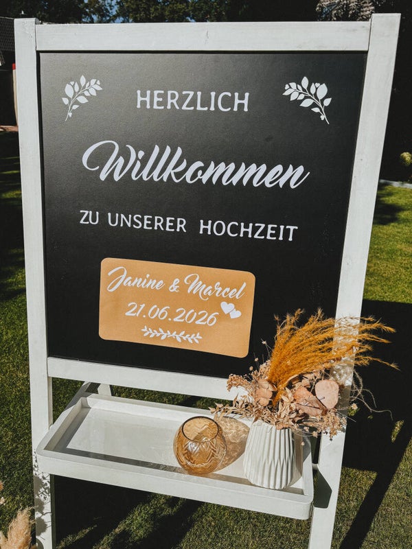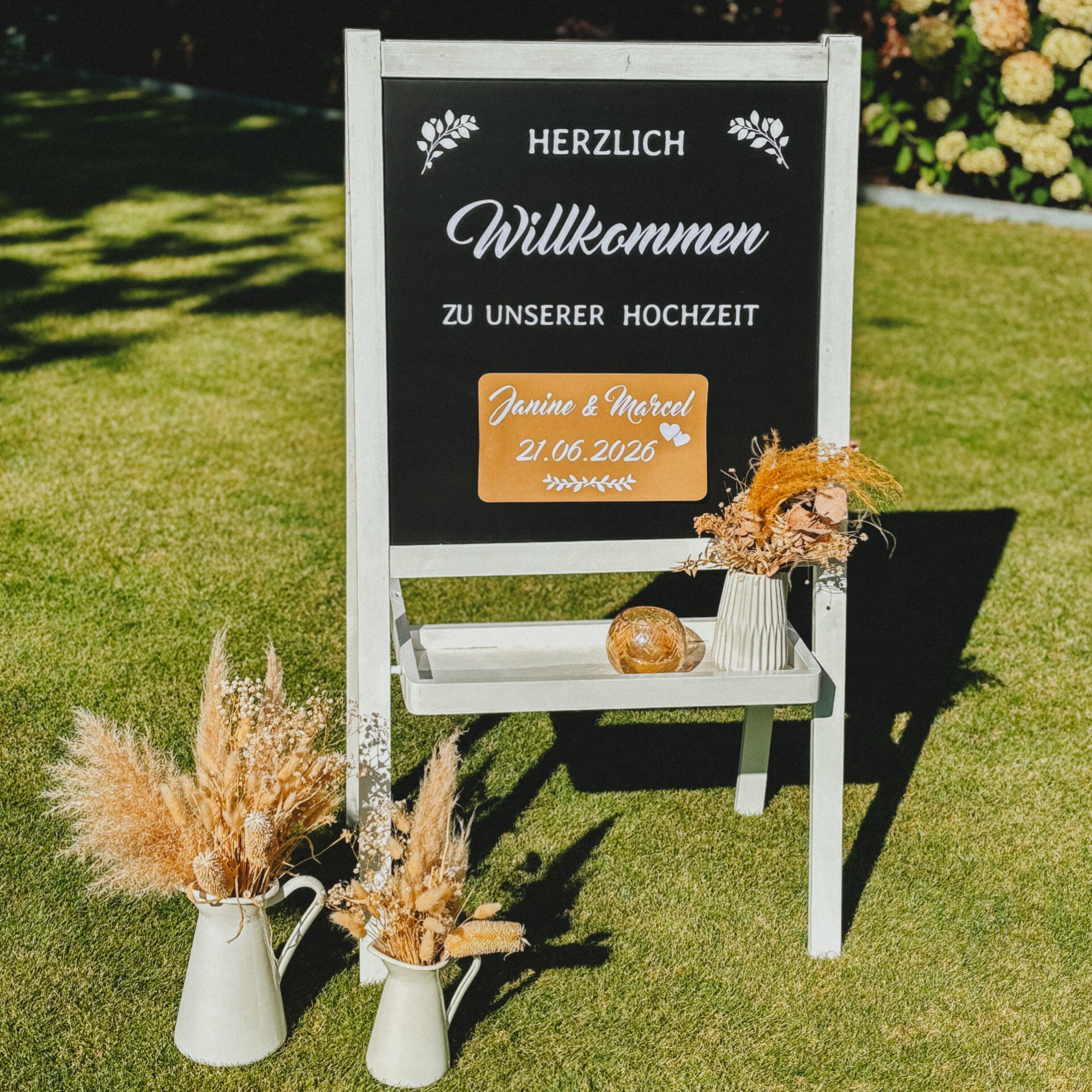 Die Tafel ist klappbar und passt somit in jedes Auto und der Transport ist absolut unkompliziert. Ein tolles Schmuckstück auf jeder Hochzeitsfeier.