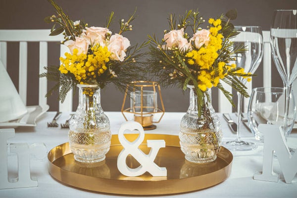 Blumen sagen soviel mehr als 1000 Worte. Unsere kleinen Marakesch-Vasen sind ein echter Hingucker auf euren Hochzeitstischen. Ihr könnt sie einfach nur auf Eure Tische stellen oder auch hübsch auf unserem Baumscheiben - Set ''Esche'' platzieren.