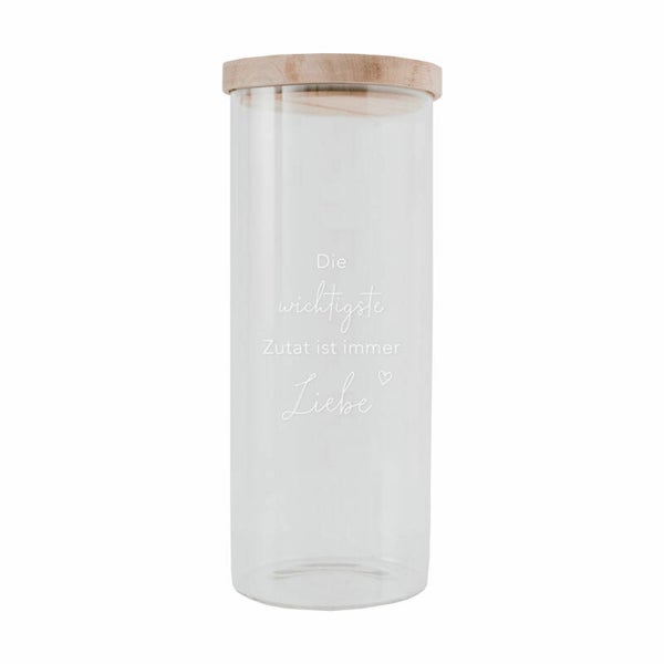 Entdecke das wunderschöne und praktisches Vorratsglas Liebe 25,5 cm aus Borosilikatglas mit Akazienholz Deckel. Dieses Glas besteht aus hochwertigem und strapazierfähigem Borosilikatglas und ist mit dem Spruch “Die wichtigste Zutat ist immer Liebe” veredelt. Es wird mit einem Akazienholz Deckel geliefert, der das Logo und das Motto “Konfetti für die Seele” eingraviert hat.