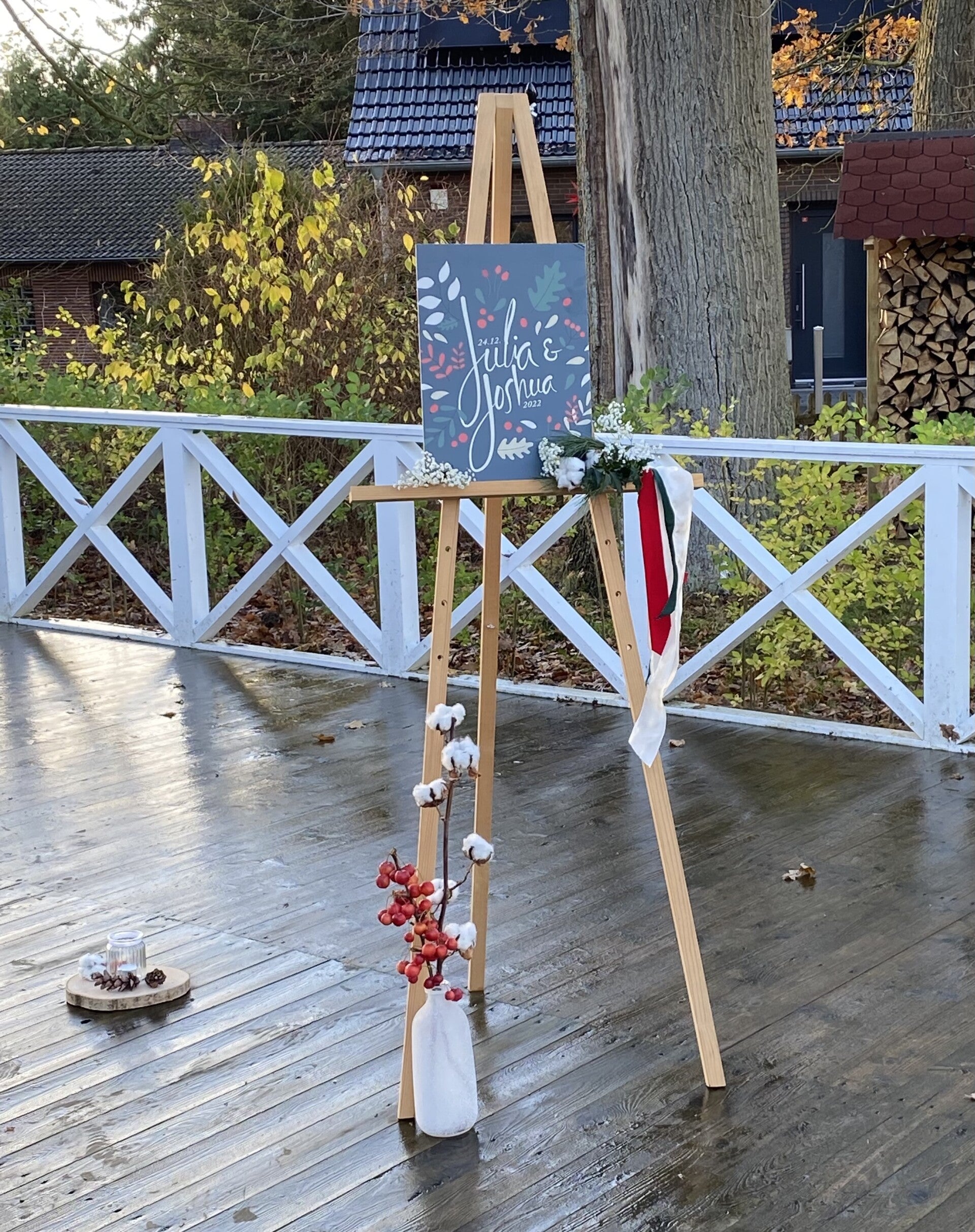 Sie eignet sich besonders gut für unser Hochzeitsgästebuch, einem Willkommenschild oder auch als Halterung für einen Sitzplan. Ob mit Blumen verziert oder auch ohne Dekoration - sie passt sich allen Hochzeitsstilen an. Der rustiakle Holzton der Staffelei passt zu jeder Hochzeitslocation.