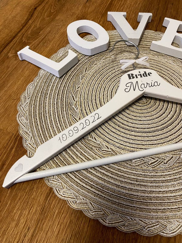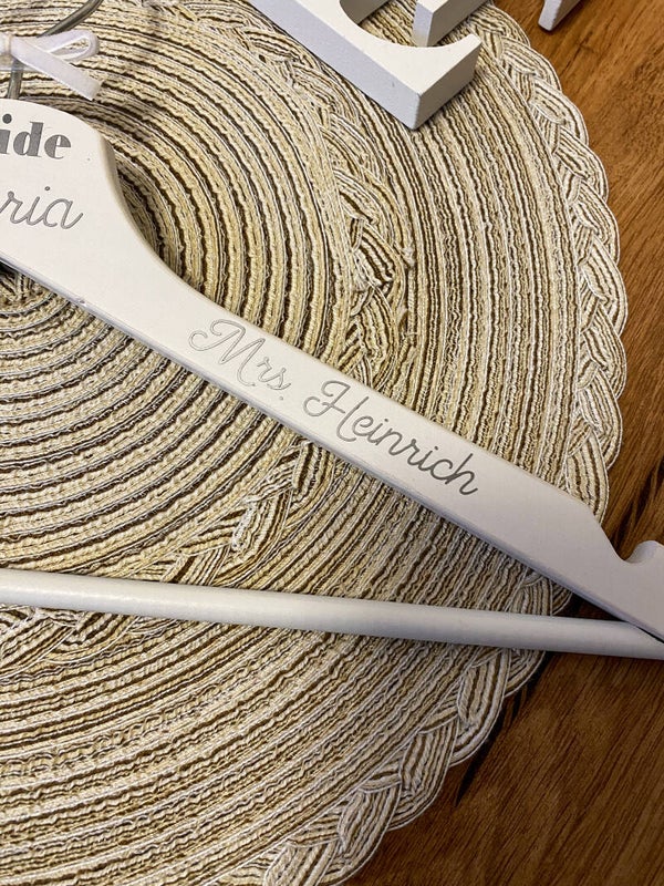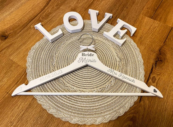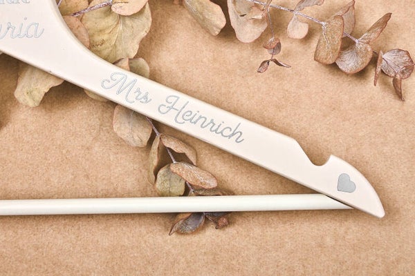 Der Bügel ist mit dem Wort Bride, Euren Namen, Hochzeistdatum und zwei Herzen in silber verziert.