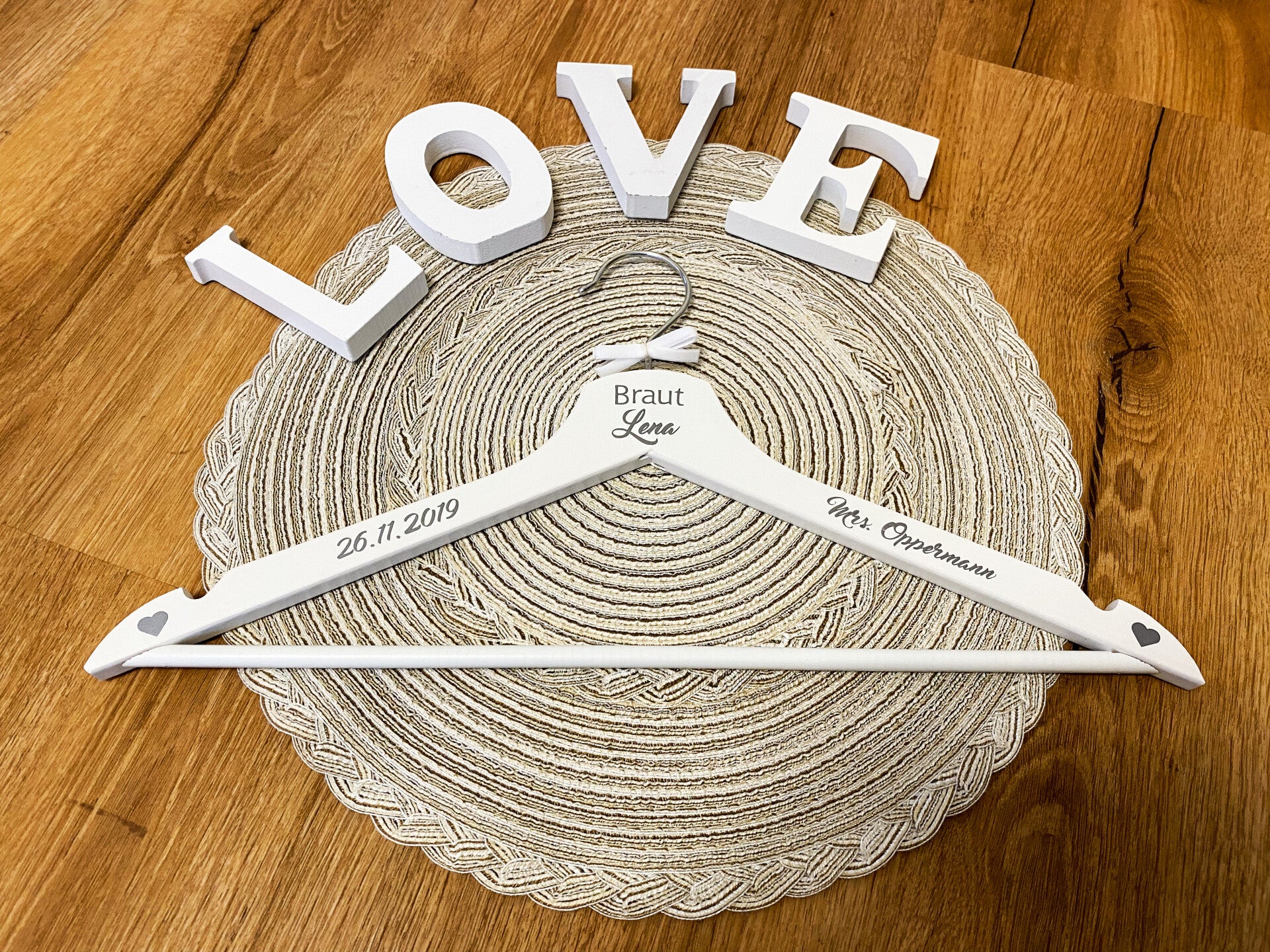 Der Bügel ist mit dem Wort Braut, Euren Namen, Hochzeistdatum und zwei Herzen in silber verziert.