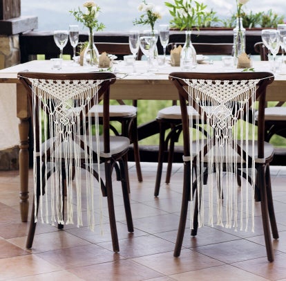 Makramee ist eine Knüpftechnik die ihren Ursprung im orientalischen Raum hat und ist in unserem Fall sogar handgeknüpft. Die Makramee-Stuhlhussen eignen sich perfekt für eine Hochzeitsdekoration im Boho-Look. Eure Traustühle, egal ob in der Kirche oder in Eurer Hochzeitslocation lassen sie so in einem traumhaften Boho-Style erscheinen. Auf dem dritten Bild seht Ihr die liebevolle Verarbeitung des hochwertigen Makramee's.